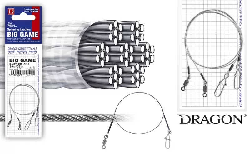 The Dragon ‘s Big Game steel pike reins series features greater load resistance and a more solid set of carabiners and swivels at both ends. They are made of high quality American Fishing Wire steel wire, and the extremely flexible 7×7 Surflon knit has a smooth nylon coating. The high resistance to bending, and hence the longer life of the high-end pike leader are a fact, especially since the knit passes three times through the crimps, which reduces the risk of pulling the line when overloaded. A total of 49 threads significantly improve torsion resistance, and the length ensures that even an attack by an unexpectedly large predator will not lead to detachment of the bait and failure to sign a quality catch.