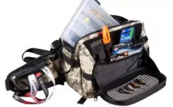 At the front you will find a pocket with a solid molded lid, in which you will find a removable foam insert for hanging lures or mounts, and there is enough space for a case with glasses, or only glasses if you do not use the insert. In addition, in the front there are two tool holders, two textile rings for attaching accessories and an elastic cord with a stopper to fix anything, including a compact garment or raincoat. The wide and extremely comfortable waist belt also has two zippered pockets, fastens with a quick and reliable buckle, and can be removed from the back of the bag by pulling, and the released strap is ideal for piercing a garment when worn on the shoulder.