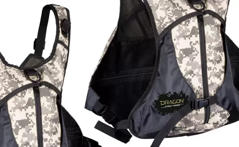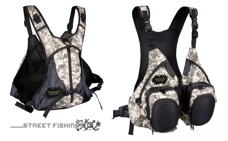 In front of you are two carabiners with hidden, stretching spiral cords for attaching tools, as well as D-rings, including the straps and back. From the chest the front part hides 4 more mesh pockets – two with zipper and velcro fastening. The compact backpack at the back of the vest Tech Vest 98-13-009 has an additional compartment inside, and a holder for clothes, bedding or another, which fastens with a buckle, partially covering the backpack. In addition to comfort, excellent ventilation and a modern camouflage pattern, the other feature of the functional design of the Street Fishing series is the precise weight distribution, so that at the end of the day you remember fishing instead of to grit your teeth from back and lower back pain.