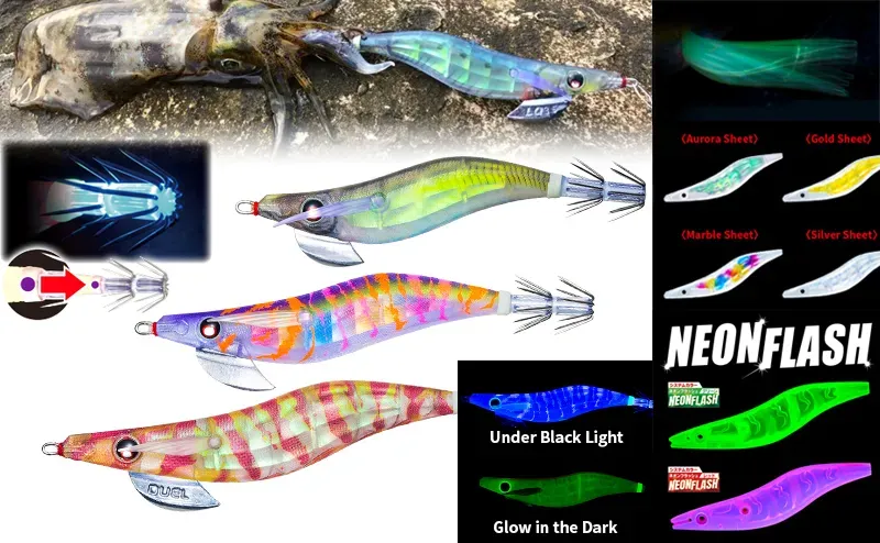 LENS + INVISICLOTH patents attract predators from afar, and in combination with the color of the body, indicated by a colored dot at the base of the tail, give no chance of hesitation at any moment. The variants are Luminous Body, UV Glow Body and Clear Body, and the NLM and NRDR colors also feature Neon Flash technology. The side fins vibrate appetizingly and further tease the squid‘s senses with their movement and glow as the lure sinks into a stable position and twitches invitingly. The double row Trick Hook hooks have a UV luminous effect and their design minimizes snagging in obstacles, so you don’t lose even one percent of the charm of the unique Duel LQ Lens Squid Jig.