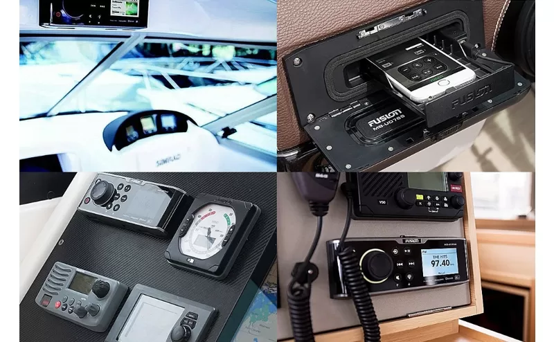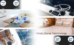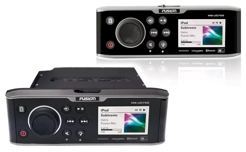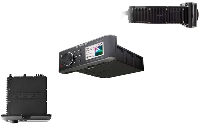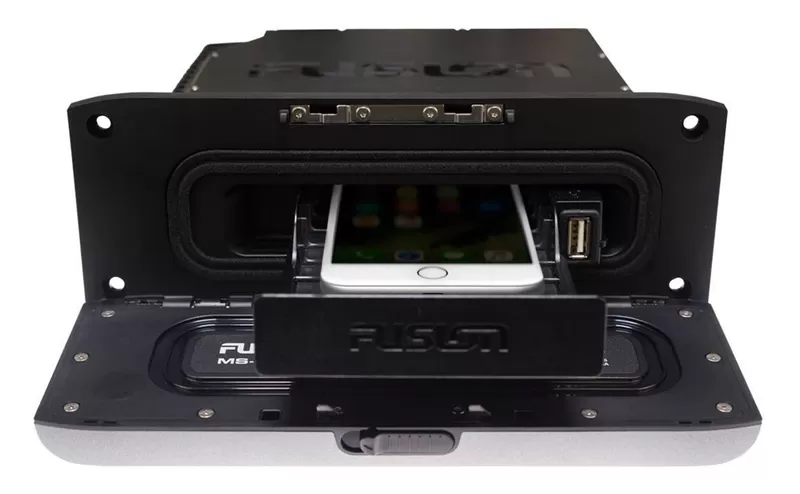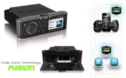 Multi-Zone technology here provides music in 4 different areas of the vessel, each with independent control and customization of menu options. The docking station with built-in phone drawer will protect your device while charging or sharing music from it. With Fusion-Link® Control plus NMEA 2000 or Ethernet connectivity and a compatible multifunction display, you get audio control at your fingertips – so you don’t lose sight of sonar even in seconds, or as the Fusion team says – Find Your Tunes and Your Tuna!