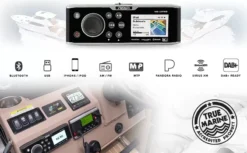 The long list of marine radio options includes NMEA 2000 / Ethernet / Wi-Fi / Bluetooth connectivity, support for AM / FM frequencies, USB and AUX ports, control via iPhone, iPod and in general, a large number of compatible devices with Apple iOS, MTP Windows and Android operating systems. You have the option of control via a compatible Garmin watch via a wireless ANT sensor, as well as DAB + support, which requires an additional MS-DAB100A module.