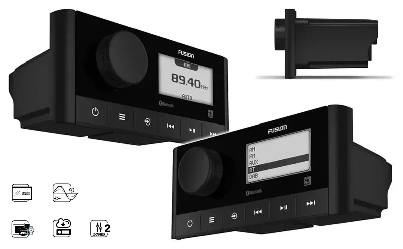 The radio operates on AM/FM frequencies, has an AUX port and a built-in DAB tuner, can be controlled remotely via any device compatible with Bluetooth wireless technology (2.4 GHz @ +12 dBm nominal) and strong>ANT(2.4 GHz @ +7 dBm nominal) as well as via compatible Garmin watches. Another extra that will make the stay on board even more pleasant is the Multi-Zone technology, enabling listening to music in two different zones of the vessel, each with independent control and customization of menu options.