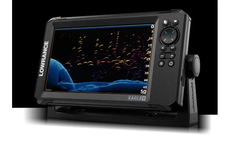 The combination of 50/200 HDI Low / High CHIRP Sonar plus DownScan Imaging of the 9-inch Eagle is a great option to have quality picture of the bottom and the area under the boat much more than usual so far, even in deeper waters. The SolarMAX display ensures perfect visibility in direct sunlight and impresses with new color palettes, and the easy-to-navigate menu allows quick handling, including the ability to personalize options and quick value access.