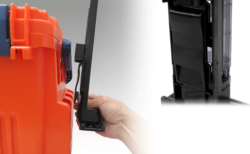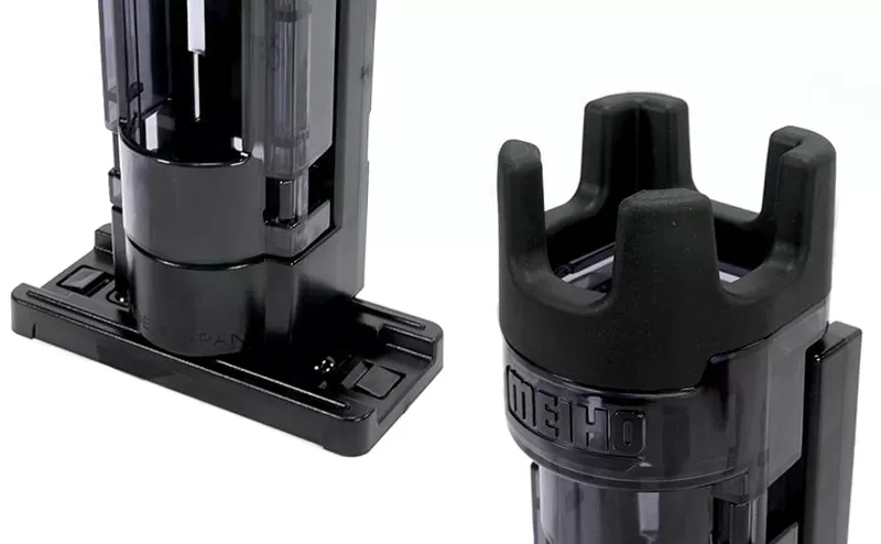 The adjustable rod stand attaches to the side slots of the suitcases extremely easily and just as quickly changes the three levels of height, making it suitable for different types of rods and fishing styles. Model BM-250 Light Rod Stand Attachment is made with a solid base and you can either carry the rods with it or leave them in standby position for a blow from another deceived fish, without having to think about additional options for pond stands.