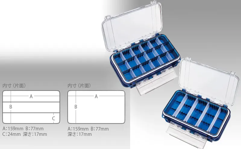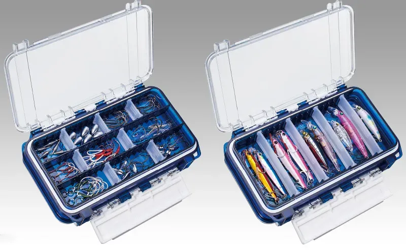 The compact size of Bousui WG Case allows it to be carried in a larger pocket, in a bag, suitcase or in the upper compartments of suitcases Meiho VS-7055, VS-7070, VW-2070 and VW-2055 where it fits perfectly. The transparent blue base is combined with well-sealed and fully transparent lids, each with its own latch, designed for one-handed operation. In addition to excellent visibility and easy handling, stainless hinges and water protection, the double-sided case boasts a weight of 367 grams for the otherwise robust and time-tested construction of the Japanese brand.