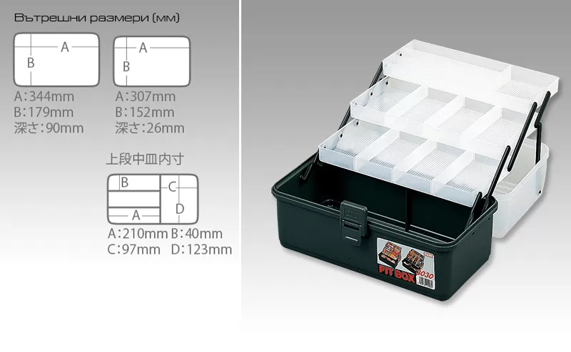 Impact-resistant material on the body and handle, polypropylene cover and reliable ABS locking mechanism promise durability and long life, and the functional distribution of the Fit Box 3030 Tackle Box is visible at a glance. The three floors of the box occupy a cascading position in the fully open position and reveal a deep bottom plus a total of three trays with compartments. The two middle ones are the same and equipped with movable partitions, the smaller one has fixed compartments at the top, and the working depth of all three is 26 mm.