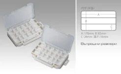 Each side has its own closing mechanism, convenient for one-handed operation, and the metal pivots on the hinges are stainless. You have good visibility through the preserved transparency of the lids, and despite its serious capacity for the compact size, thedouble-sided case weighs 186 grams and can fit both on the top of Meiho cases VS-7070, VS -7055, VW-2070, VW-2055 and others, as well as in almost any bag or larger pocket. The working depth of the compartments is 16 mm.