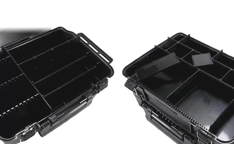 The shockproof case has a copolymer body and ABS lid, has a secure double locking mechanism, separate for each of its two parts, with stainless steel metal elements. The bottom is equipped with rubber pads for more stability on different surfaces plus a large and comfortable handle that carries it without any problems. Three of the bulkheads in the large main compartment have slots at the top edge for hooking hooks or ready jigs.
