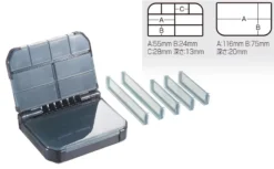 Folding double-sided box VS-318DD from the Meiho Versus series, extremely practical for storing small accessories and accessories such as hooks, jig heads and weights. The inner depth of the two parts is 20 mm and 13 mm, so for a pocket size box the model is quite practical and functional, a slightly larger version of the little one VS-315DD. On one side you have a total of 8 compartments of different sizes, each with a separate lid. In the deeper half, the distribution is up to you, thanks to two longitudinal and three transverse movable dividers, the length of which is suitable for storing silicones up to about 4 – 4.5 inches.