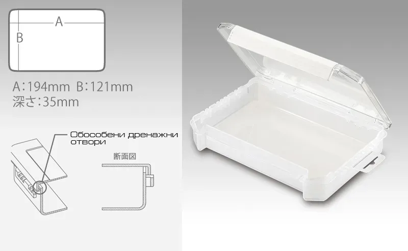 Fully transparent Meiho box without dividers and slots, the volume of which you can dispose of completely freely. VW-2010ND-M (Multi) Type is from the Versus Wave product line, which means that the workmanship is classy, the materials are as durable as possible, and handling is more than easy and pleasant. The model weighs only 172 grams and is distinguished by the separate drainage channels between the cover and the body. Their design allows you to rinse baits or other tackle inside the box itself, then close and drain the water. Residual moisture will evaporate, and at the same time, water cannot penetrate inside either through the bottom or from accidental splashes.