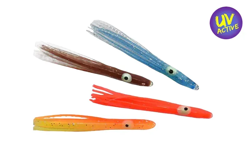 Mini Silicone Rig Squids with bright rich colors and tried and tested iridescent colors that react to UV lighting, with some of the details also emitting their own luminosity. Ideal for making saffron rigs, also when fishing for perch from a boat or high bank on freshwater trips.