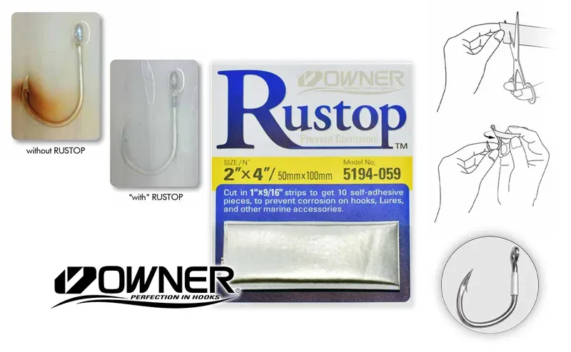 One package of Owner Rustop Prevent Corrosion 5194-059 contains one strip measuring 5 x 10 cm. Depending on the size of the hook, use scissors to cut narrow strips about 0.5 to 1.0 cm wide, which you wind at least 3 mm below the eye of the hook. When the foil is covered with rust, replace it with a new one. With one package, you can protect up to a dozen hooks, as well as metal lures or other accessories at risk of corrosion. The innovative product of the renowned brand is environmentally friendly, easy to handle and the perfect option for anglers who prefer to fish with the lighter and more durable high carbon steel hooks instead of stainless steel.