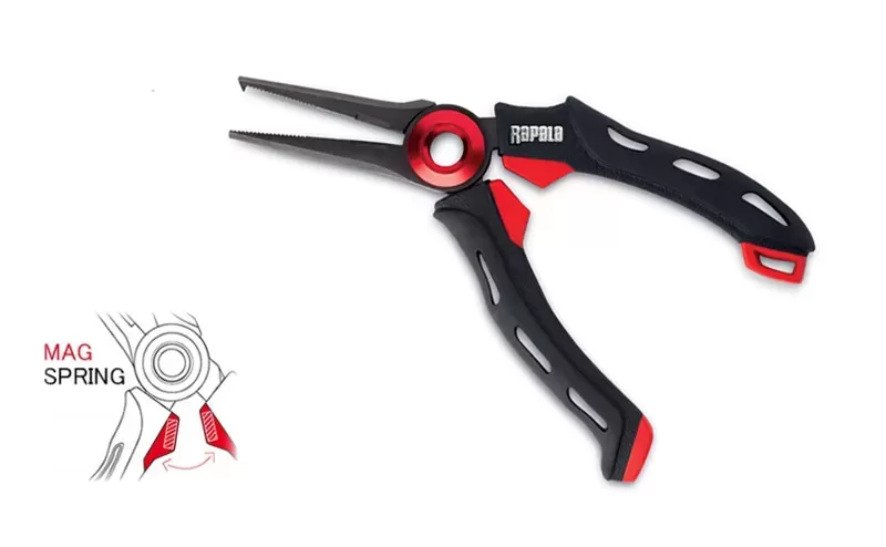 Rapala magnetic pliers, whose Mag Spring mechanism replaces the standard spring and, in addition to working extremely smoothly, saves the usual worries such as losing its strength over time or causing jams in more Rough handling. The built-in magnets repel and keep the jaws and handles open, so one-handed operation is more than easy. Pliers have a toothpick for dissolving Split Ring Rings, suitable for rings up to size 0 for the 15 cm version and up to size 3-5 for the larger, 18 cm model, which also differs in that it comes complete with a plastic case. Sturdy jaws also have a serrated part for a firm grip plus a fiber cutter.