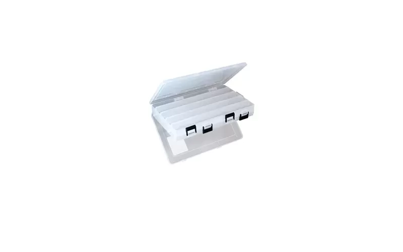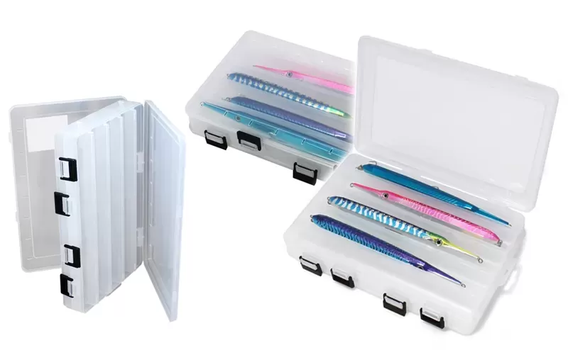 Double sided lure box designed for long wobblers and jigs, very convenient when fishing is short or compact storage size is important! You have a total of 8 triangular compartments – 4 on each side, with separate double fasteners and excellent visibility into the interior of each through the transparent material.
