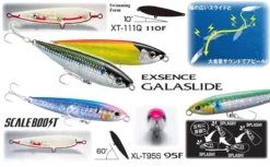 The 20-gram Shimano Exsence Galaslide XT-111Q 110F wobbler has a remote casting and can cover a distance of over 50 meters. It also differs in shape from the previously known similar models, with its high, laterally flattened profile. The body is designed in a way that increases displacement and makes wider side movements with ease, and Walk-The-Dog slider action is unsurpassed. The 9.5cm variant XL-T95S 95F is listed with a flight of around 44 meters, with tighter lateral movements and with a much greater tail angle to the surface when pausing to reel.