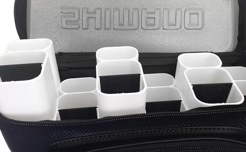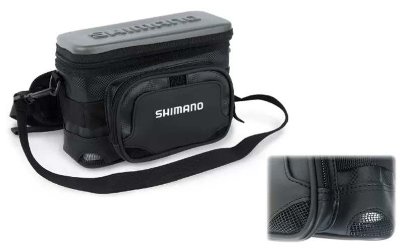 Lures stand upright, each in its own compartment and protected from each other, including the top, thanks to the hard-formed lid with embossed Shimano logo. An added bonus to this type of design is the quick access, whether you choose to carry the bag on the waist or over the shoulder. You can move the partitions inside and take full advantage of the functionality. A zippered pocket for small accessories awaits you at the front, and the durable and easy-to-clean PVC material pleases the eye with a carbon pattern.