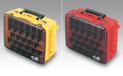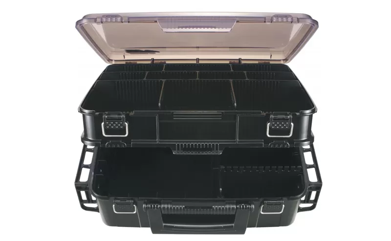 The body is made of impact-resistant copolymer, and the hinges have stainless steel pins, just like the metal parts of the extremely secure locking mechanisms. Each compartment of the double-sided fishing suitcase has independent locking and vents to prevent moisture retention and sweating. The transparent, smoky-colored top lid provides visibility to the inside before opening, especially useful if you decide to use removable partitions and place your accessories directly between them. One option for this model is to remove all or part of the movable partitions and use the large volumes between them to arrange boxes of different sizes that you have previously filled with lures and everything else needed for fishing. Customizing your suitcase with removable partitions that fit extremely accurately in the channels is flexible and easy to handle in any situation.