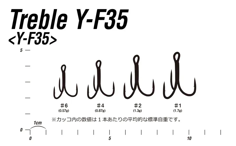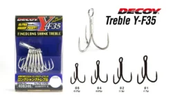 The relatively narrow curve combined with the long arm gives the Decoy Y-F35 some advantages that can turn the tide in your favor in many situations! First of all, the trеблеe hooks of the series are suitable for both fresh and salt water, and they work great on a variety of lures – pencil and minnow wobblers, as well as other surface patterns or ones for jerking.