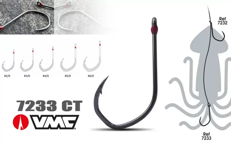 VMC 7233 CT ReDenteX Back is a specific model of a single slow trolling hook, designed for mounting at the rear end of the bait in combination with a model 7232 CT. Both hooks are designed for this purpose and the use of live bait, as well as to complete the Stewart rigs. The ear is closed with the so-called. Red Closed Eye technology, which is a coating with a special red resin that protects the line from tearing or abrasion, so that thinner fibers can be safely used.