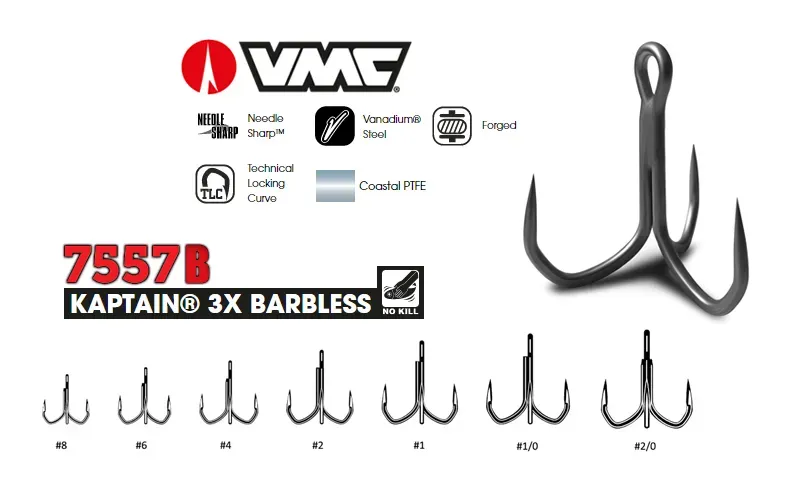 The offer from VMC for ultra-reliable barbless trebles for sea fishing tested against some of the strongest marine predators! In addition to being hardened, the vanadium steel of the 7557B CT Kaptain 3X Barbless is shaped with a Technical Locking Curve design at the curve, which keeps the fish from coming loose despite the lack of a barb. Simultaneously, Coastal P.T.F.E. the coating improves and increases the speed of penetration, as well as protects the hooks from corrosion.
